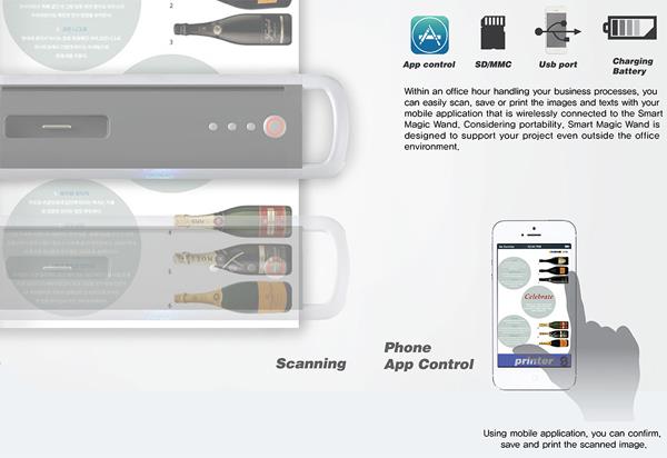 常规打印机无法满足便携性,而便携式打印机却不能打印常规尺寸的文件,而NamGyun-Kim 设计的 Smart Magic Wand 是一款便携式的打印机和扫描仪的结合体。它的体积比一本 16K 杂志还略小一点,加上它是可充电设备,一次充电可连续工作三至四个小时,方便放在包包里随身携带。 Smart Magic Wand 正面上有一个带有 USB 的手机槽...