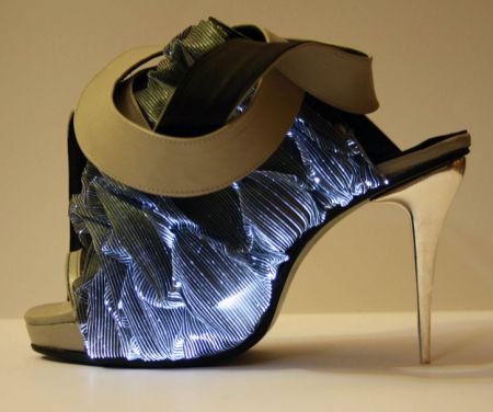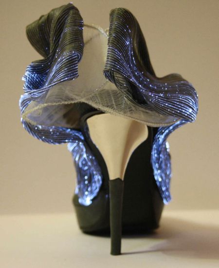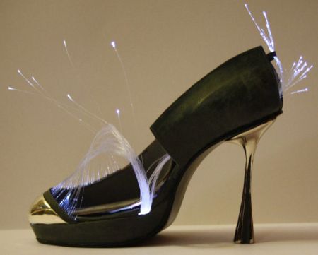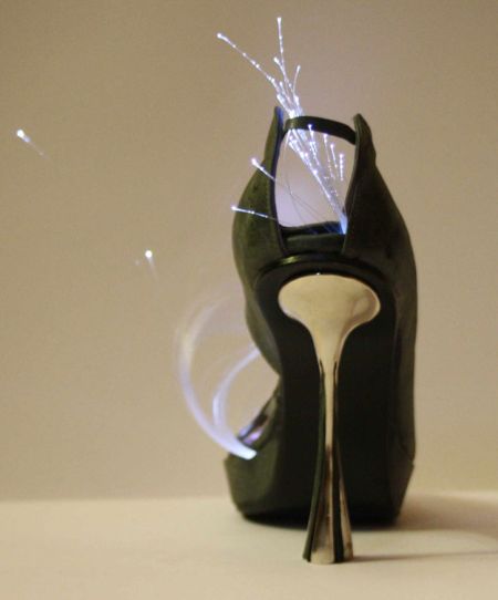 这双发光的高跟鞋做工精细,造型优美,让人为之眼前一亮。它的表面一部分由光导纤维制成,底部还带有LED灯,鞋面发出幽蓝色的光线。穿上它,可以让您在夜晚变得格外耀眼。