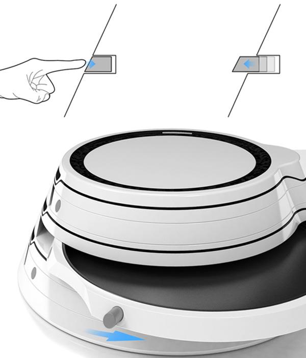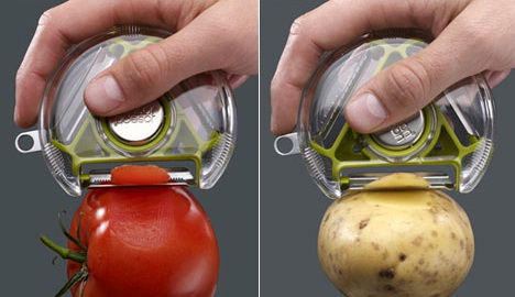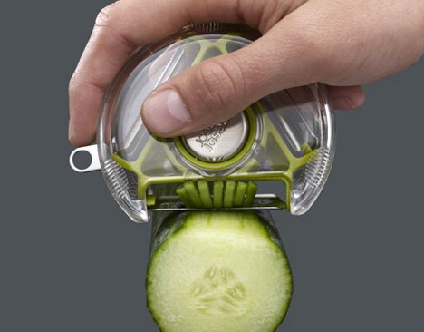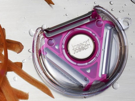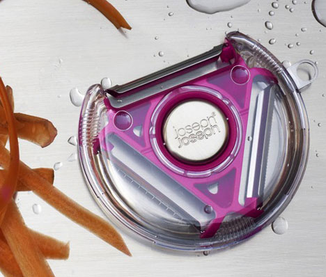 这是一个像小磁盘一般的削皮器,它有三个不同的刀片,通过旋转调整合适的适用的刀片进行操作。不同的需求迎刃而解。