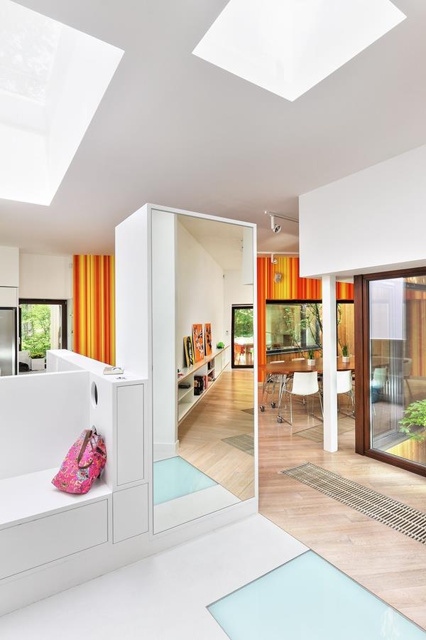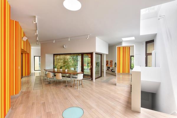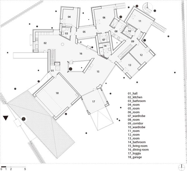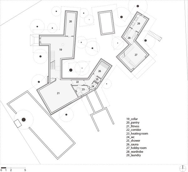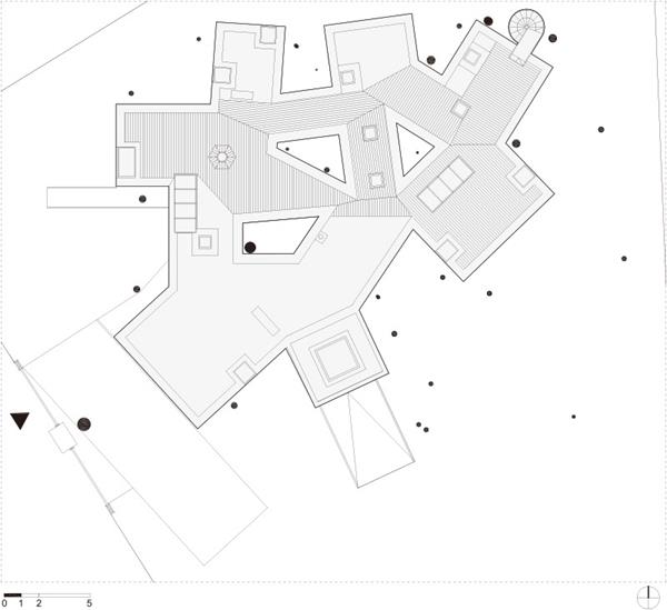 这栋位于华沙树林中的建筑,必须要在不破坏现状树木的条件下进行建设。为此建筑的外表皮呈凹凸状,凸起像触手一样伸向树林深处,凹处则避开场地上原有的树木,同时中间体量开了几个内庭院,为现状树木腾出足够的生长空间,也为建筑内部空间带来更多的光与风景。与树木共生,占地面积300平方米的建筑严格遵守场地现状----不破...