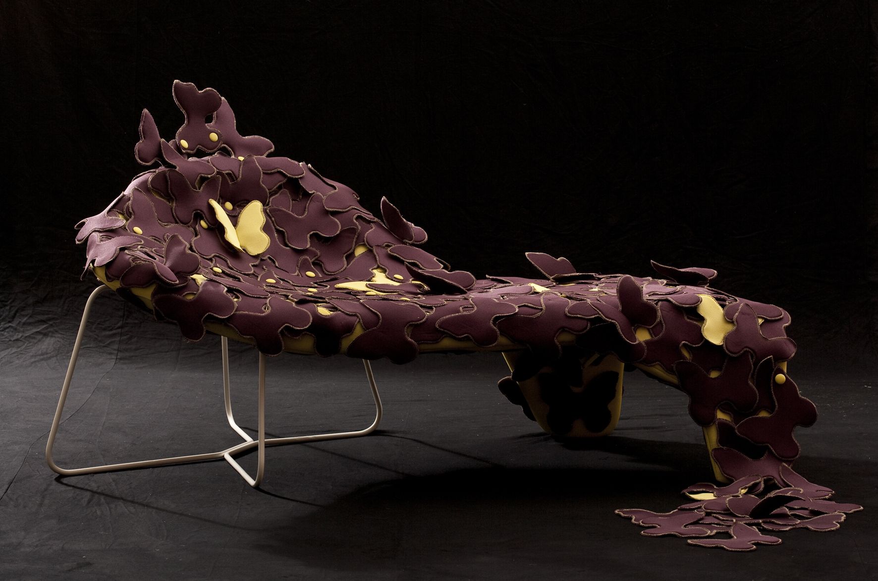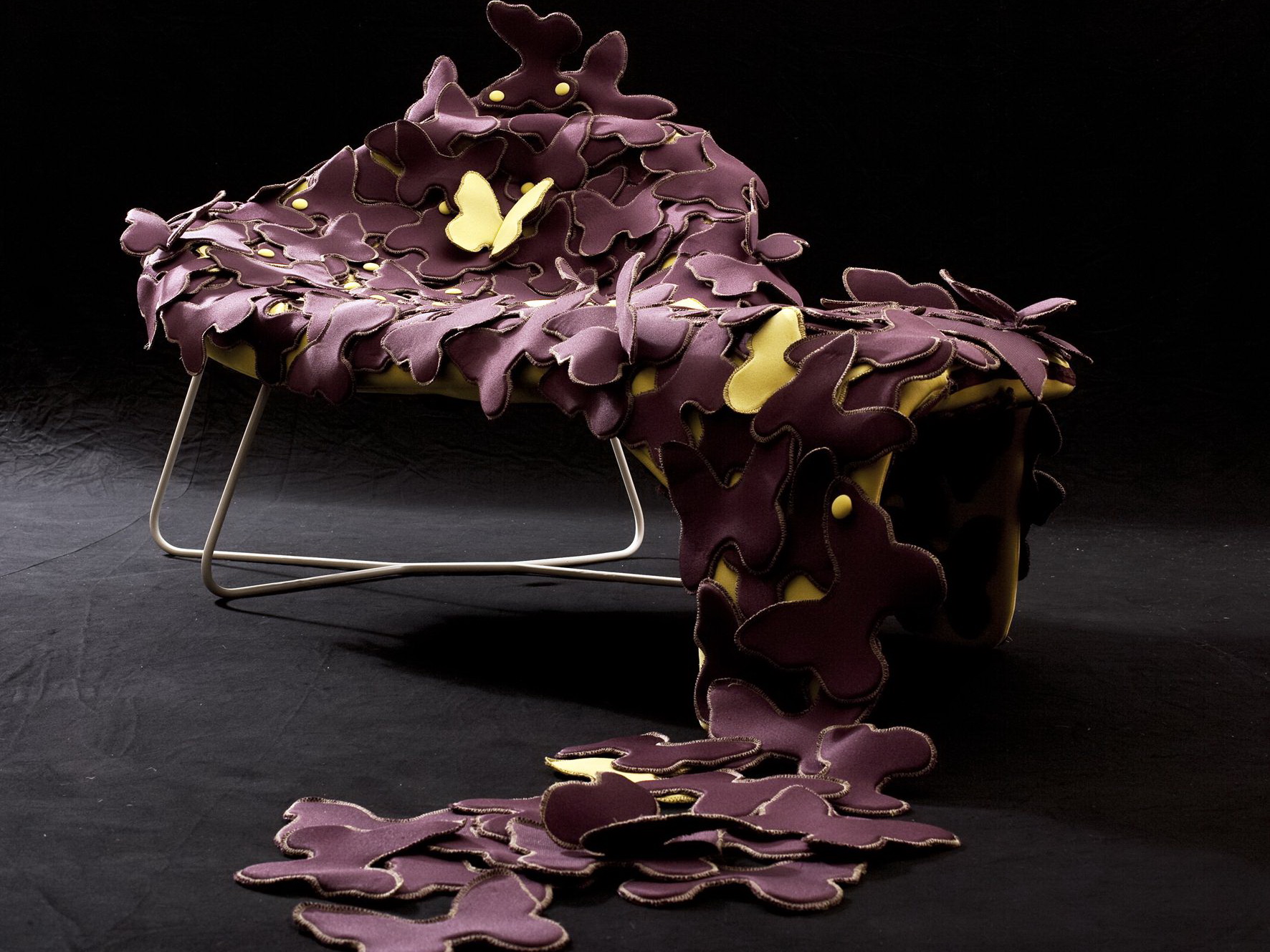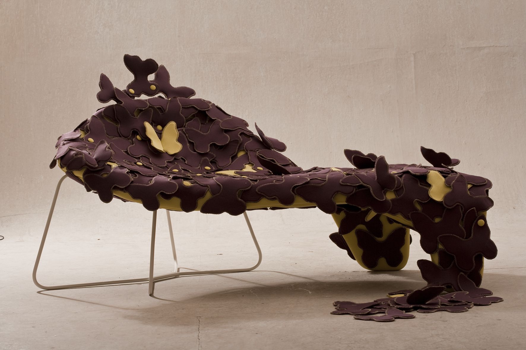 来自d.sign21设计室的德国设计师Simone Völcker带来这张蝴蝶沙发椅:Papillon chaise longue。成百只蝴蝶飞舞追逐的画面构成了沙发椅面。