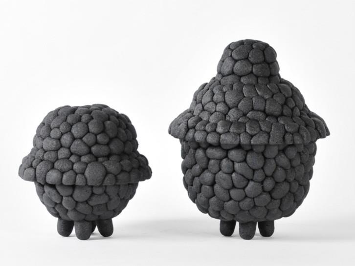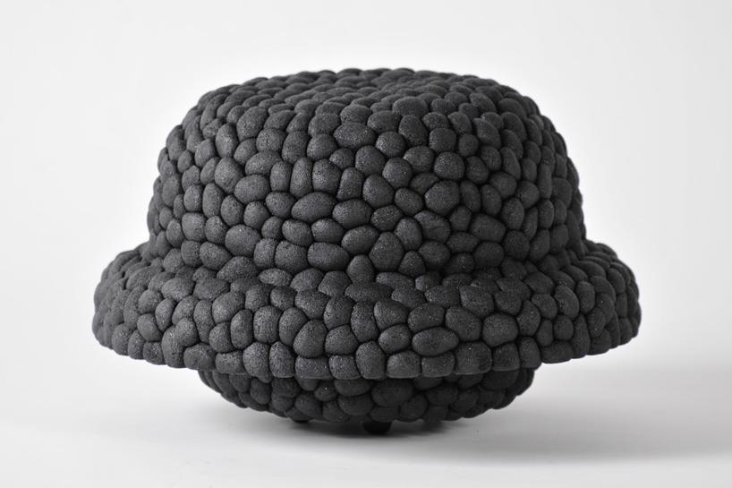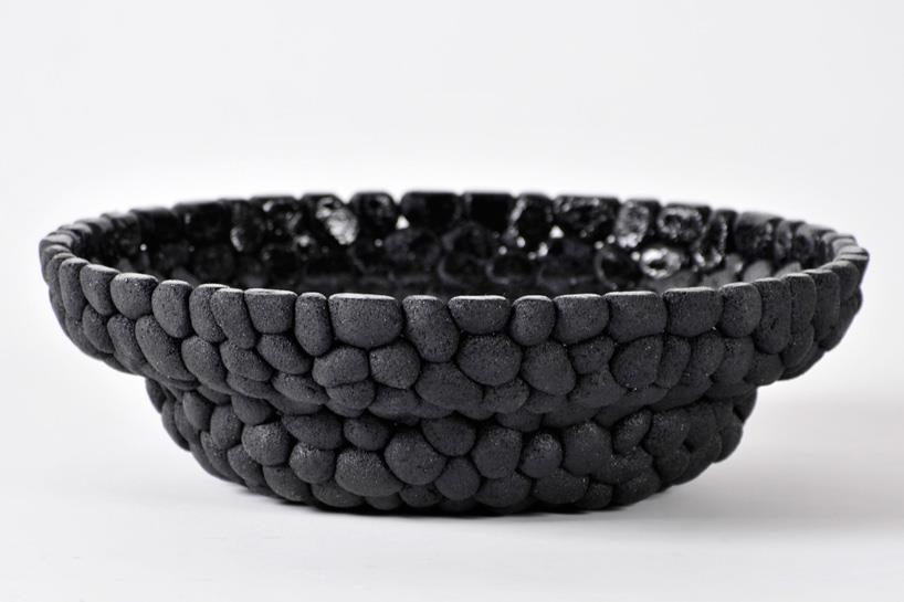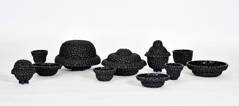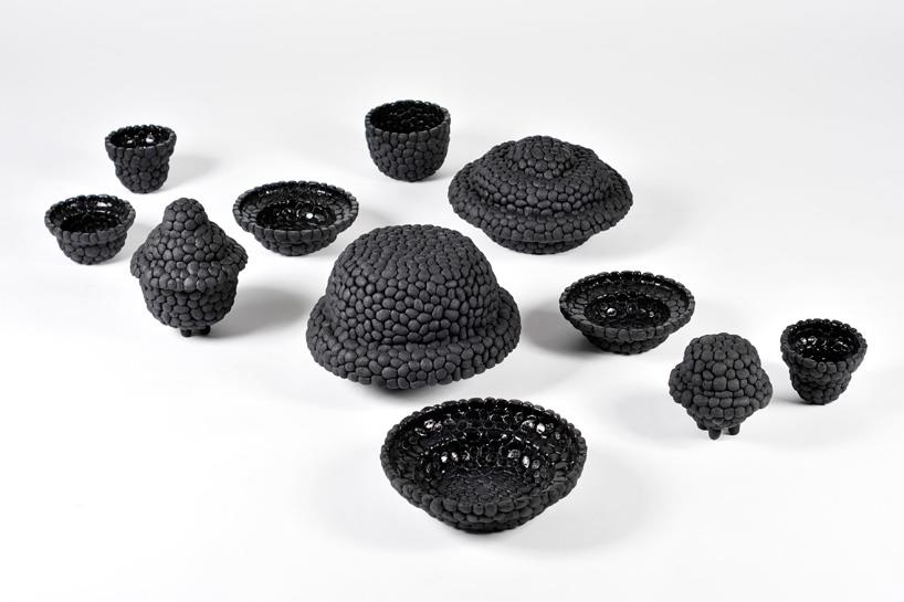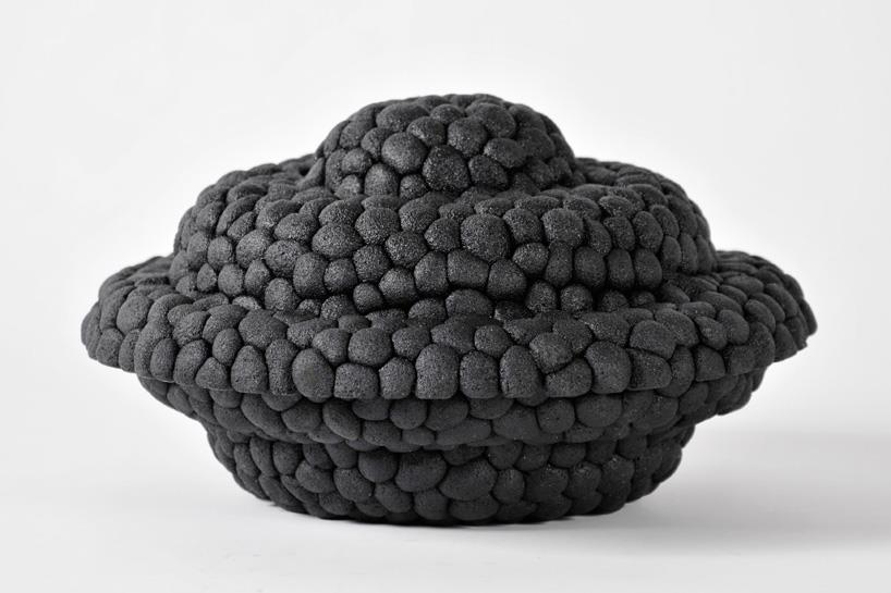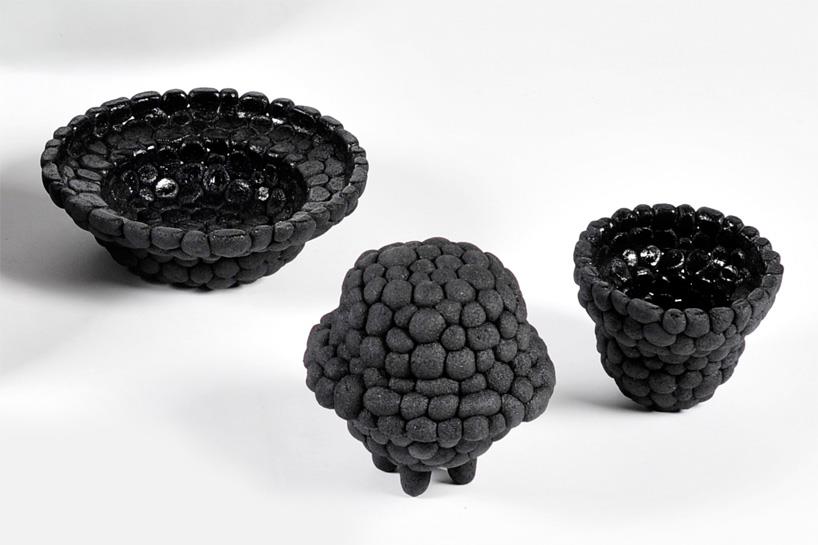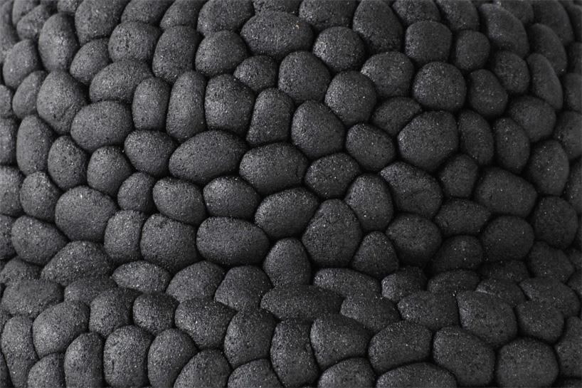 debbie wijskamp最近设计的作品“black ruby”,这组碗和壶产品是用一种不太可能的材料制作的——汽车废轮胎胶粉和聚氨酯成膜剂材料。这组容器全都是用像泡泡一样的工业介质小圆球组合而成的,这些小球就好像组合零件,一个个拼接在一起,组合成产品。