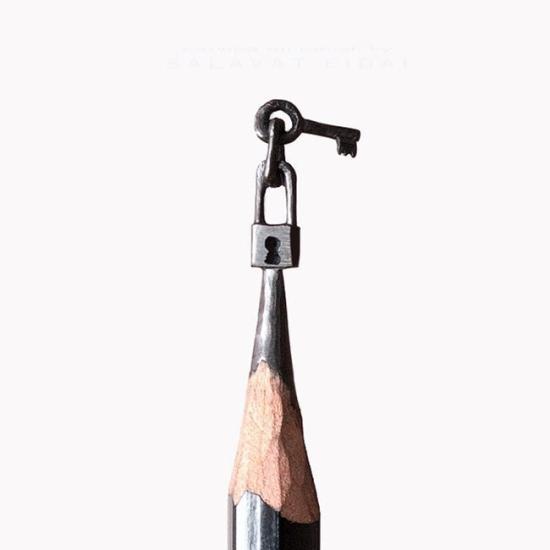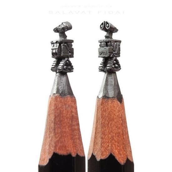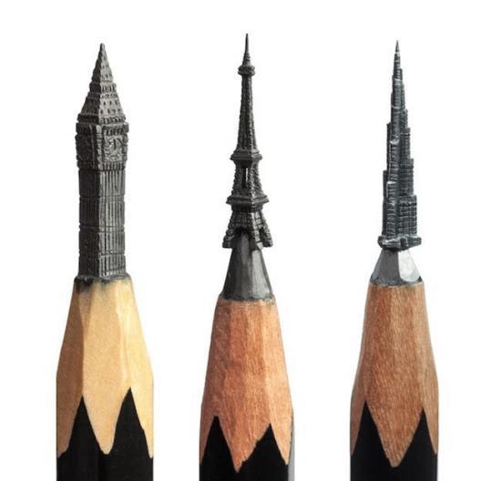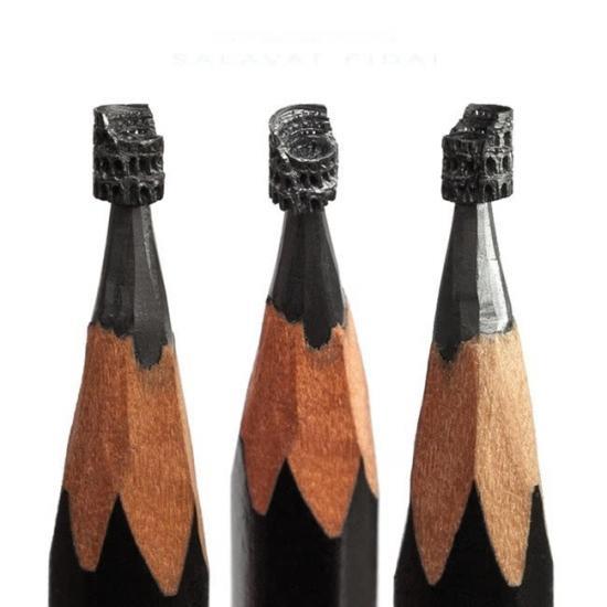 铅笔包裹着的石墨铅笔芯又细小又脆弱,平时用来写字稍微用点力都会断开,来自俄罗斯一位艺术家向难度挑战,在铅笔尖上雕出各式人物、著名建筑和动物雕塑。这不仅要足有耐心,更需要艺术家拥有高超的雕刻手艺,而他所用到的工具仅是一把X-ACTO刀。