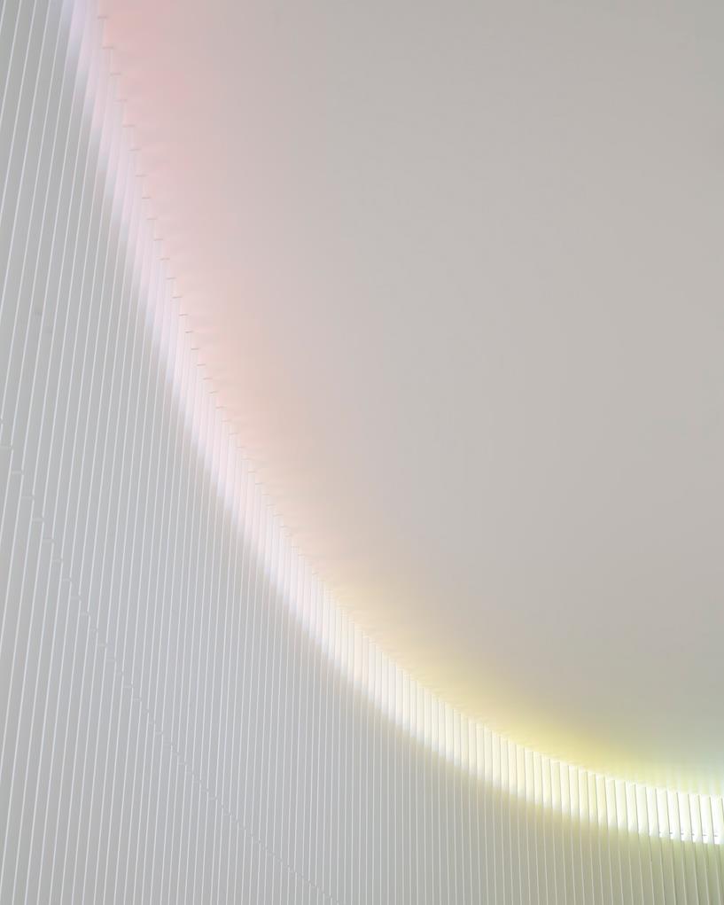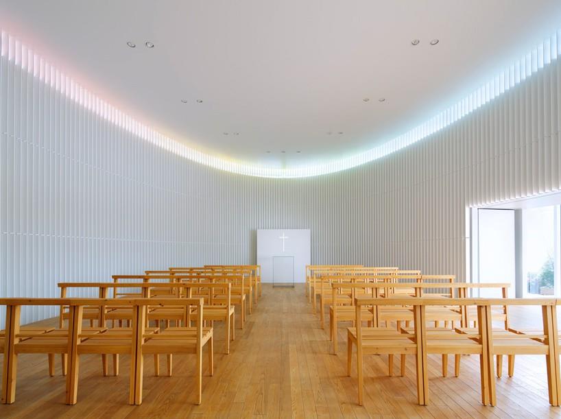 日本工作室kubo tsushima建筑事务所受到委托改造一座位于东京惠比寿的婚礼教堂。设计去掉了过多的装饰,把重点放在以自然光赋予生命力的空间上,椭圆形的房间内布置有一排排木制的椅子,后部做了一个简单的变动。方案将自然光作为一种点缀,采取利用高侧窗并安装有色反射板的策略,使得日光被反射形成一种柔和的彩色光芒。光...