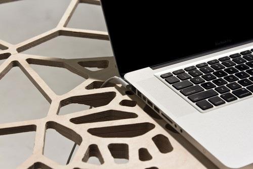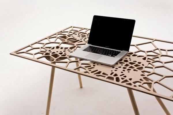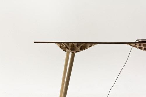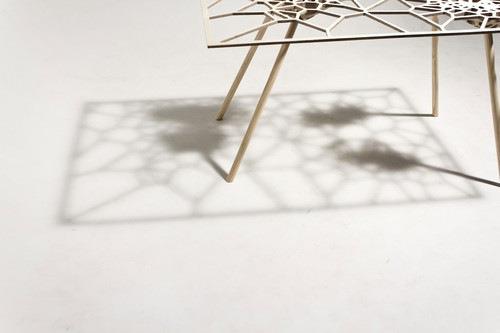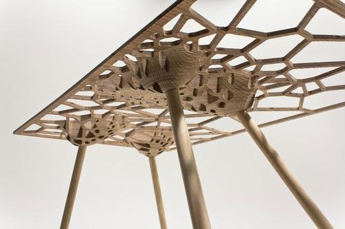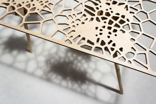 新西兰工业设计师sam stringleman通过计算机科学计算而得出的网状结构不但疏密有致而且颇具中式屏风上那种栅格的美感但是随机性更强一些。整个桌面采用了胶合板雕刻成型。